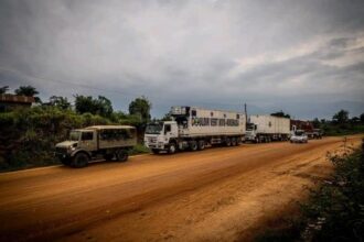 Le premier convoi du Couloir Vert Kivu–Kinshasa (CVKK), transportant des…